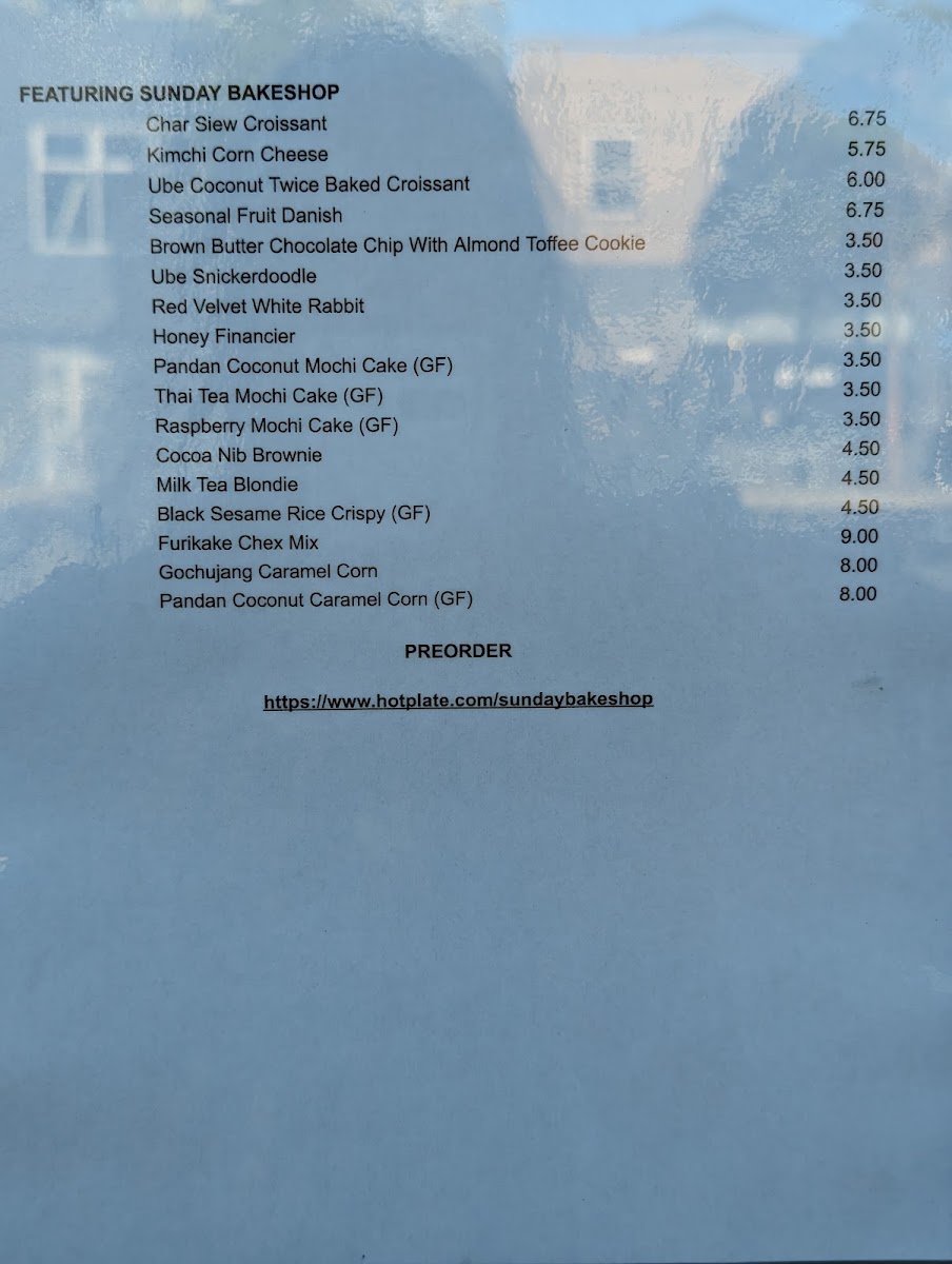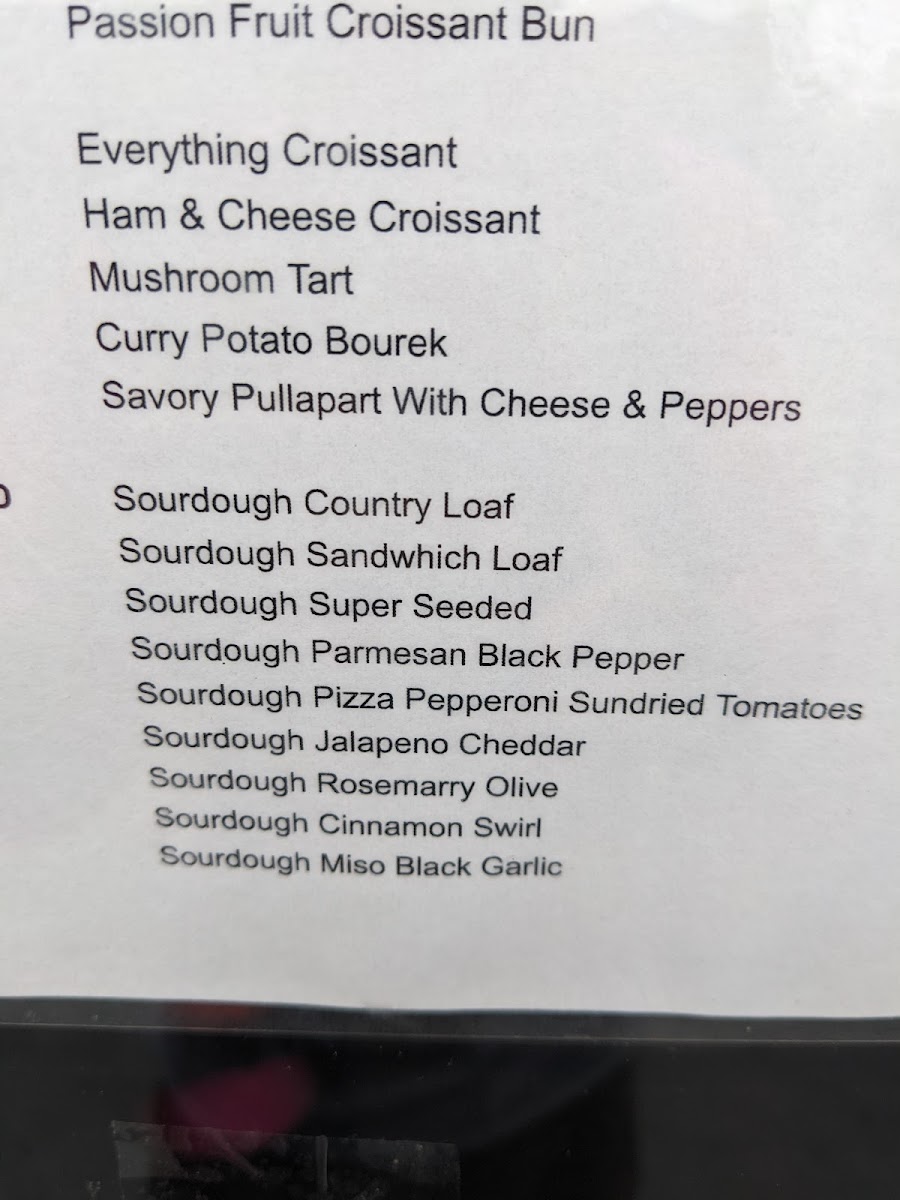 The menu features a range of bakery items primarily focused on freshly baked breads and pastries. Visitors can expect an assortment of croissants in various flavors such as pistachio, blackberry, ube, matcha with adzuki bean, and ham and cheese combinations. Additional offerings include items like tarts, quiches, savory sandwiches such as the char siu croissant sandwich, and other baked goods including bread pudding and monkey bread.